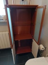 mobile bagno conponibile, Mobile alto ciliegio con sotto anta bianco panna e sopra doppia anta in vetro smerigliato opaco bordata ciliegio, interno con piani in vetro H 137, P 34, L 36. Mobile basso con 2 cassetti cornice