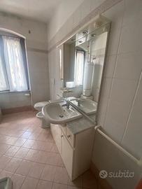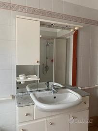 Mobile contenitore bagno color bianco e marmo (grigio) con specchio e lavandino.