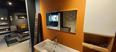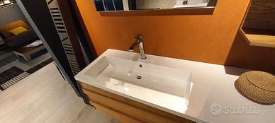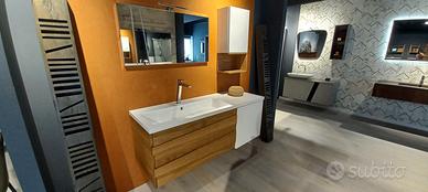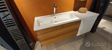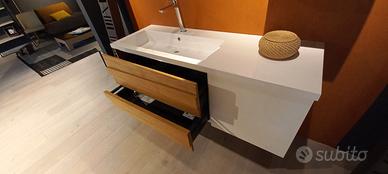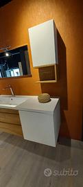 Mobile bagno sospeso L. 146 H. 53.5 P. 51 cm composto da base lavabo con 2 cassetti legno massello e anta laccata bianco opaco. Pensile L. 35 H. 65 P. 21 con anta bianco opaco e vano a giorno legno. Specchio con lampada L. 95 H. 50 cm.