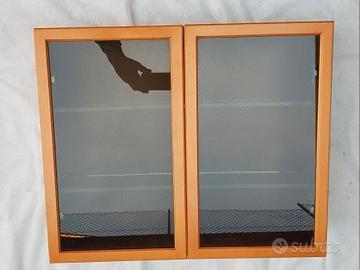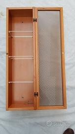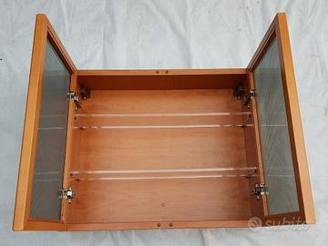 Mobile bagno di qualità in ciliegio massello, composto da specchiera con cornice in legno e lampada in vetro murano (cm 90x98), ripiano con cassetti a rotazione (cm 90x16), 2 mobiletti pensili a vetrinetta con ripiani interni trasparenti (cm 90x25x16 e cm 60x50x16). Tutti i componenti sono montabili separatamente e componibili a piacere.