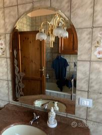 Mobile bagno in legno con piano in granito rosa con specchio. Composto di due pezzi separabili. Lavabo misura 112 cm di larghezza e 58cm profondità. Mobile a fianco larghezza 40cn e lunghezza 93cm. Abbinato a armadietto sospeso larghezz