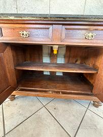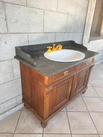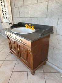 Vendo mobile bagno con piano in marmo. I cassetti sono decorativi ( finti ). Altezza da terra fino alla spalletta del marmo “dietro i rubinetti” è 90 cm, invece la larghezza è 110 cm Da terra fino al piano di marmo è di 77cm La profondità del marmo è di 55cm, invece quella del mobiletto sottostante è di 49cm. Possibilità anche di trasporto. Da concordare eventuale prezzo in base alla distanza della consegna.