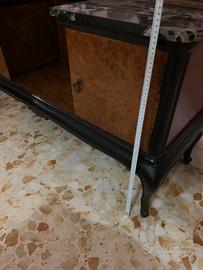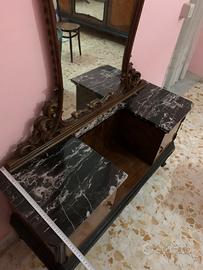 Bellissima ballerina in legno massello con inserti in radica e ripiani in marmo nero. Completa di specchiera con cornice a intarsio barocco