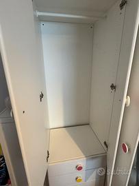 Tenuto benissimo e comprensivo di cassetti e ripiani. Adesivi su pomelli removibili.