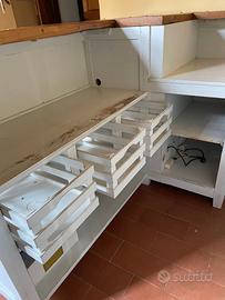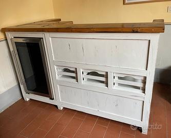Vendo mobile bancone usato in azienda vinicola per la vendita diretta. Il mobile è composto da una struttura bianca dotata di vani e cassetti, e da un piano superiore sempre in legno, lavorato, spesso e robusto, effetto "tagliere" di alta qualità. Le dimensioni sono: larghezza 182cm, altezza 112cm, profondità lato corto 51,5cm e lato lungo 101cm (vedi foto annuncio).