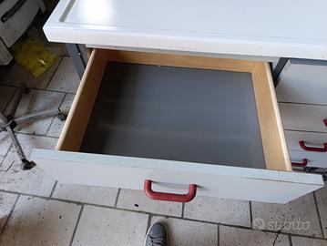Mobile con piano da lavoro per laboratorio in ceramica, attacchi per la corrente , 9 cassetti più un anta , possibilità di togliere i cassetti poiché sono tre parti distinte..... molto pesante il piano.... misure 180x80x91