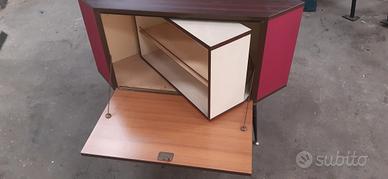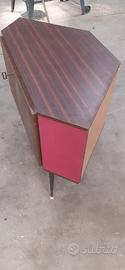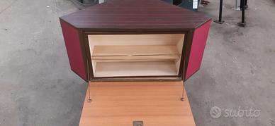 vendo mobile bar ad angolo vintage anni 50-70 in legno laminato, fianchi sono rivestiti in velluto rosso. il contenitore interno è girevole e si possono appoggiare i bicchieri nella parte anteriore, mentre il retro con specchio può contenere bottiglie di vino o liquori
