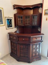 Vendo mobile bar angolare in legno massello con vetrinetta, completo di 2 sgabelli coordinati.