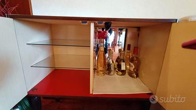 Interno diviso in 2 parti,una con ripiano in vetro e pareti rosse e nell'altra vano per bottiglie con fondale a specchio e luce interna.