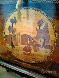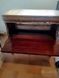 Mobile bar anni 50 stile Maggiolini con antina ribaltabile con specchio interno e due cassetti misure larghezza 98/profondità 40/altezza 100 legni noce/faggio/radica noce/acero