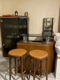 Mobile bar originale degli anni 70. Comprende mobile angolare con vari scomparti all’interno. Mobile vetrinetta a 2 ante. 2 sgabelli.