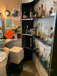 Mobile bar vintage anni 80 in ottimo stato con frigo bar (funzionante), plafoniera acciaio e 4 puf in pelle bianca.