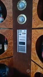 Mobile Bar anni '80 in radica, con 8 nicchie per ospitare le bottiglie, luci regolabili d'intensità, radio con mangianastri.
