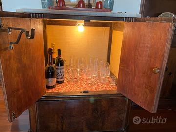 Vendo una piccola credenza della ptima meta dell800, presumibilemte usata per contenere spezie o caffe ( all’interno è presente un gancio per stadera ). Adibita negli anni 50 a mobile bar ( vedi foto) Legno di noce in parte massello ( a cannetté ) ed listrato nella parte inferiore.
