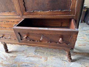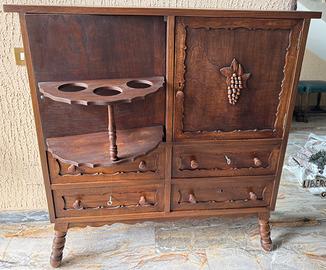 Mobile bar intarsiato in legno con scomparto girevole e cassetti in ottimo stato di conservazione