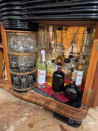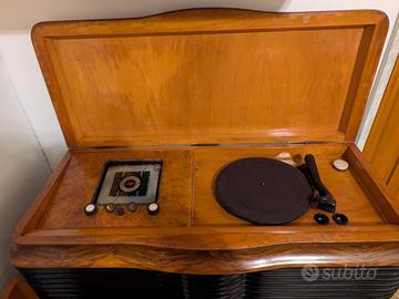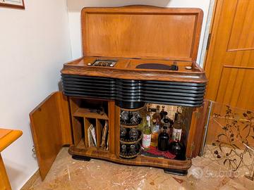 Vendesi splendido ed esclusivo mobile multifunzione in pieno stile Art Déco, raro Mobile Bar Art Déco con Radio Carisch e Grammofono – Vintage anni '40/'50, un vero pezzo di storia del design e dell'artigianato. Perfetto come pezzo d'arredamento centrale per un salotto elegante, un ufficio di rappresentanza o un locale a tema. L'antina in vetro del vano bar presenta una rottura (come da foto), ma conserva la decorazione originale.