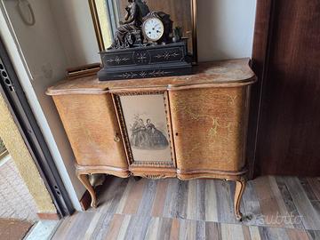 Questo mobile bar Art Decò risale agli anni 40/50 e presenta un esterno in radica di noce, con un interno in vetro e specchi che aggiunge un tocco di raffinatezza.