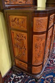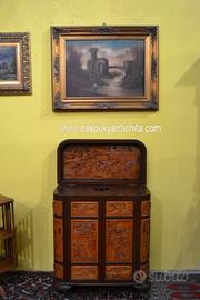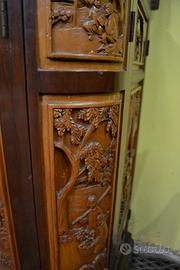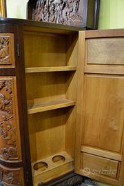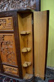 Magnifico mobile bar cinese in legno di canfora asiatico, risalente alla meta del XX secolo ( 1950 circa ) riccamente intagliato su tutti i lati raffiguranti scene di vita quotidiana e paesaggi