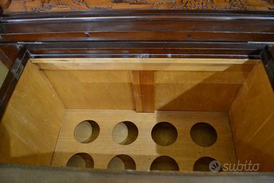 Il pannello superiore si apre per rivelare una zona di servizio, anch’essa decorata intagliata, mentre la parte inferiore presenta scomparti per riporre le bottiglie, due ante frontali e due ante per ogni lato portabicchieri e portabottiglie, sorretto da piedi intagliati a forma di artiglio