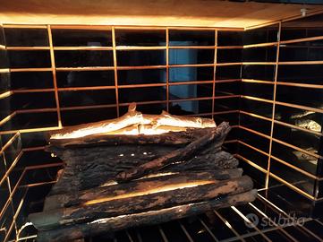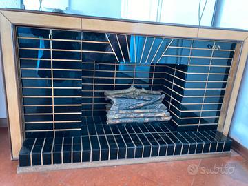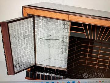Mobile bar o credenza originale a forma di camino, struttura in palissandro massiccio e frontale e giunti in acero , rivestita con piastrelle in vetro opalino nero di Murano. Ha due ante laterali con interno mosaicato a specchio, che si illuminano. Il piano è in vetro opalino nero di Murano. Il vano centrale contiene un finto camino che si illumina. Sopra il mobile c'è un'imponente specchiera con decoro stile liberty, con tutto il contorno che si illumina . L'oggetto vintage è in buono stato e completamente funzionante, presenta una leggera usura dovuta all'età e all'utilizzo, uniche riparazioni sono alcune piastrelle di vetro opalino ricollocate e rifissate ma sempre integre. Le ante interne del bar, il finto camino centrale e il contorno della grande specchiera sono dotate dell'originale impianto di illuminazione perfettamente funzionante. La grande specchiera presenta due piccole macchie nere. Le misure del mobile sono: lunghezza cm.139, altezza cm. 78, profondità cm. 50 compreso zoccolo che sporge cm. 11,8 anteriormente. La specchiera che va collocata sopra il mobile, è alta cm. 166, lunga cm 137 e profonda cm. 6.