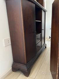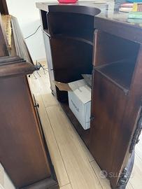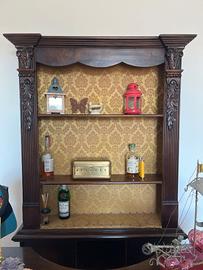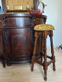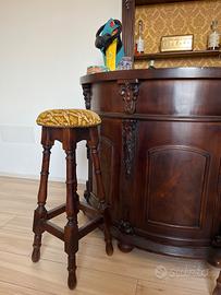 Vendo elegante mobile bar da casa in legno scuro, in stile classico/vintage, completo di 2 sgabelli coordinati con seduta imbottita. Il mobile è ideale per arredare: •taverna •soggiorno •mansarda •sala hobby •angolo bar in casa Presenta una struttura molto scenografica con: •bancone frontale curvo •ripiani porta bottiglie e oggetti •finiture lavorate / intagli decorativi •rivestimento interno decorativo •2 sgabelli abbinati Misure bancone: 1.03 x 1.40 x 0.50 Misure mobile porta bottiglie: 2.10 x 1.06 x 0.26 Misure sgabelli: 0.84 x 0.33 Ritiro a mano. Trasporto a carico dell’ acquirente. Per ulteriori foto o info scrivete.