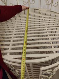 Mobile in ferro battuto bianco stile shabby chic. Ha una forma a bottiglia è diviso in due parti: nella parte inferiore a cui si accede aprendo le ante trovano posto le bottigle posizionate orizzontalmente su rasrelliera, mentre nella parte superiore c’e il lato bar che é composto dal ripiano da una mensola che segue il profilo curvo della strittura e in alto i portabicchieri. Bellissimo ed orginalissimo pezzo di design, funzionale e di diffcile repeimenti sul mercato. Unico nel suo genere. Vendo per cambio casa.