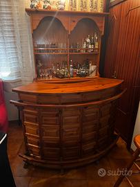Vendo splendido set mobile bar completo, ideale per arredare una taverna, una zona living o un rustico. Il mobile è realizzato in vero legno di pino massiccio, caratterizzato dalla tipica finitura a bugnato che conferisce un aspetto solido ed elegante.