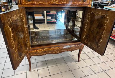 Mobile bar con luce intarsio floreale in radica di noce. Larghezza 110 profondità 44 altezza 131 Luce interna con die ripiani laterali per le bottiglie