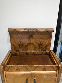 Mobile bar in radica di famiglia, costruito da mio zio, anni 50. E' stato restaurato ed è appartenuto sempre alla mia famiglia. Lo scomparto inferiore è foderato con tessere di specchio. Conservato sempre con molta cura. Vendo per cambio casa. Le misure sono: larghezza cm 83, profondità cm 42 e altezza cm 86.