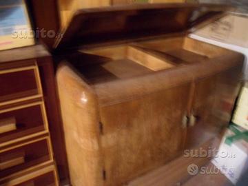 Mobile bar in radica di noce, stile anni 50, due ante, oltre una anta superiore per adattamento giradischi;