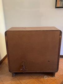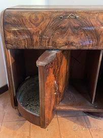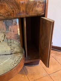 Bellissimo mobile bar in stile decò con sportello centrale girevole, porta bicchieri e liquori, porta dischi, struttura in legno di noce e radica, con annesso grammofono. Mobile da collezione, discrete condizioni, presenta leggeri e normali segni del tempo ed utilizzo che ne testimoniano l'originalità d'epoca di ottima fattura e design, collocabile in qualsiasi ambiente e stile.