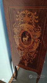 L'interno intarsiato offre due ripiani in vetro per liquori più luce interna, il mobile è sorretto da quattro gambe mosse, adornate da intarsi.