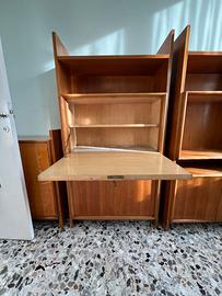 Set mobile multifunzione di produzione italiana anni '50 in stile Mid-Century. La struttura presenta fianchi a "vela" e un'ampia sezione centrale a ribalta. Il mobile è caratterizzato da una decorazione artistica sul frontale: un disegno a tratto (paesaggio con ponte) realizzato su fondo chiaro, tipico delle produzioni d'arredo milanesi e brianzole del periodo (stile Dassi/Borsani). • Struttura: Legno con venatura a vista e finitura lucida. • Configurazione: Vano superiore a giorno, ribalta centrale (uso scrittoio/bar) e vano inferiore con ante battenti. • Dettagli: Interni in legno chiaro, ferramenta originale in ottone, serrature funzionanti. • Condizioni: Ottimo stato vintage. Struttura solida, lievi segni di usura coerenti con l'età. Set composto da 4 mobili. 40€ cad.