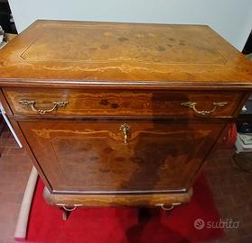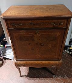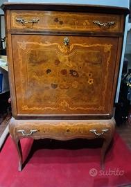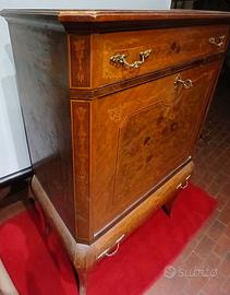 Mobile bar, Francia sec. XX, in legno intarsiato a due cassetti , sportello a ribalta con specchio, cm 77x43x121