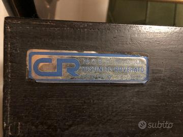 Mobiletto bar a ribalta con apertura a vasistas risalente agli anni '50. Il mobile presenta una struttura in legno con un'apertura a ribalta decorata centralmente con un'illustrazione. La struttura portante è in acciaio verniciato nero e con rotelle. L'appoggio superiore è in vetro. L'interno è rivestito in acciaio inox a specchio. Le dimensioni sono lunghezza 80cm, profondità 40cm, altezza 93cm. Creazione del mobilificio Costiniti Roverato di Padova. Ritirabile a Paullo (MI).