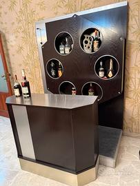 • Parete Attrezzata (Retro Bar): Pannello a muro coordinato con caratteristici vani circolari a incasso per l'esposizione delle bottiglie, illuminazione integrata e finiture in metallo.