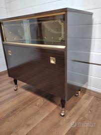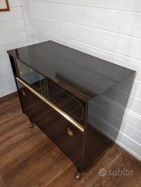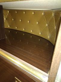 Mobile bar vintage con ruote. Capiente vano bottiglie con sportello a ribalta e vetrina per bicchieri, con due ante scorrevoli e rivestimento interno in tessuto trapuntato color oro. Misure: larghezza cm.84, profondità 42, altezza 82. Consegna a mano L'Aquila, Teramo, Pescara