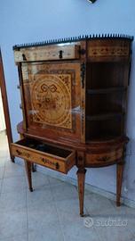 Mobile bar vintage, anta a ribalta con mensole in vetro interne e luce, mensole angolari esterne, 2 cassetti