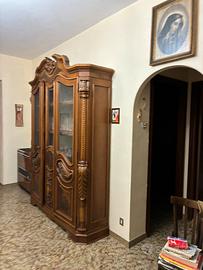 Il mobile in foto è una vetrina in stile classico, probabilmente di ispirazione barocca o neobarocca, realizzata in legno massello con dettagli intagliati e vetri, e presenta una lavorazione elaborata sia nella parte superiore che sui pannelli frontali e laterali.