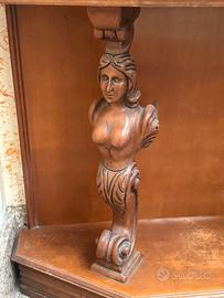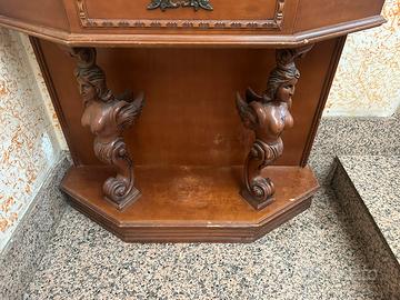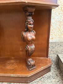 Bellissima consolle d’angolo in legno massello scuro, in stile barocco con elementi classici. Caratteristiche principali: • Forma a angolo perfetta per sfruttare gli angoli della casa • Specchio centrale ottagonale con cornice in legno • Due eleganti cariatidi (figure femminili scolpite) che sostengono la parte superiore, molto decorative e di grande impatto • Cassetto superiore con maniglia in metallo decorata • Base sagomata e intagliata con dettagli classici • Colonna tornite laterali con elementi decorativi