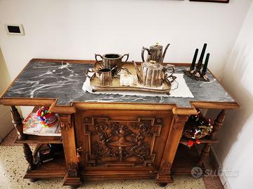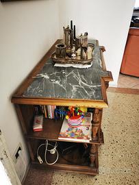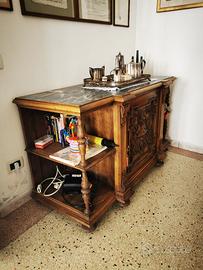 Mobile in legno con ripiano in marmo, ha due ripiani laterali ed una anta frontale, al cui interno si trova un cassetto e due ripiani. Presenta alcuni forellini di tarlo. Alto 80cm, lungo 140cm, profondo 60cm.