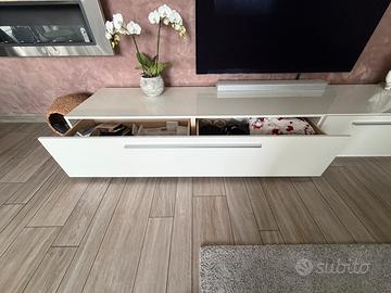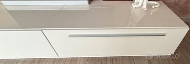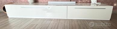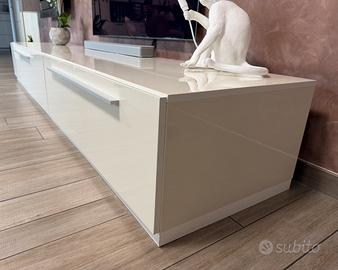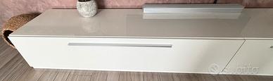 Mobile basso porta TV con cassettoni con maniglie argento satinato, bianco lucido, sia corpo che ante. Diviso in 2 pezzi(uno 120x58x40 e l’altro 180x58x40) quindi possibilita di tenerli uniti come in foto oppure separati. Struttura capiente e ben resistente.