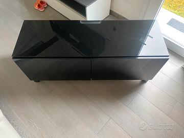 Mobile basso da salotto nero lucido IKEA 120 cm larghezza, 42 cm profondità e 50 cm altezza; 10 cm altezza piedini. Foro sul retro del mobile per passaggio cavi. In perfette condizioni