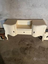 Mobile vintage color panna in legno vero, composto da due ante laterali e un cassetto centrale, gambe e dettagli decorativi intagliati, in buone condizioni con normali segni del tempo. Prezzo trattabile.