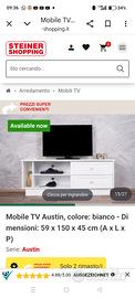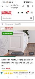 Mobile Porta TV nuovo imballato nella sua confezione originale. Larghezza 1,50 cm,, Profondità 45 cm cm, Altezza 59 cm. Valore 540 euro lo Vendo per 100 euro .Ritiro a domicilio Napoli