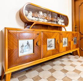 Vendo mobile buffet anni '40 come in foto (contenuto escluso), completamente restaurato e rivestito internamente, costituito da due scomparti singoli con cassetto superiore e scomparto centrale doppio con ripiano. La parte superiore con vetri scorrevoli, con disegno a motivo floreale ottenuto con molatura è provvista di ripiano. Il mobile misura cm 212 L x cm 45 P x cm 88 H; la vetrina misura cm 153 L x cm 23 P x cm 54 H. Trasporto a carico dell' acquirente,