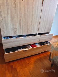 In basso due cassetti lunghi da 90cm e profondi 43,5cm per biancheria, magliette o indumenti e due cassetti 44,5cm profondi 43,5cm.