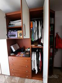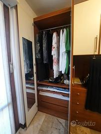 Descrizione: bel mobile di ottima fattura e in perfetto stato, colore noce con pannelli frontali color panna. Dimensioni: altezza 250 cm, profondità 60 cm, larghezza 270. Oltre ai quattro cassetti esterni, ci sono sul lato sinistro due ulteriori cassetti interni e due ripiani. All’interno dell’anta sinistra c’è un comodo specchio lungo. Sul lato destro c’è una capiente zona libreria a giorno. Al centro è presente un ampio vano dove si può alloggiare per esempio un televisore. La zona centrale alta e l’anta singola hanno entrambe al loro interno un ripiano a mezza altezza.