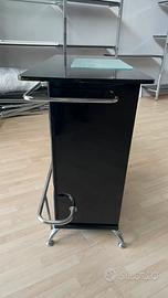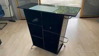 Mobile cassa negozio con particolare decorazione , immottito e intarziato , con gambe colore argento e varie cassette nel retro