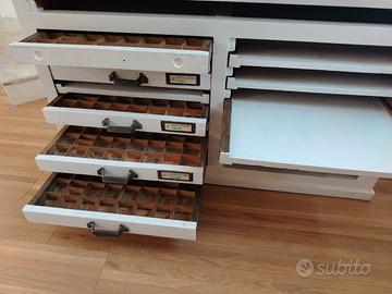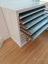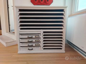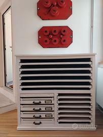 Mobile contenitore caratteri tipografici, cliché, riutizzato in studio tecnico come contenitore disegni, fogli, cartelline e schizzi. Molto capiente e robusto, in massello di legno e lastre metalliche. Misura cm 105x60xh100